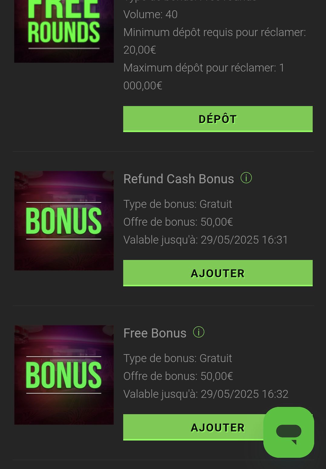 et m’ont renvoyé un autre mail après leur appel en me disant qu’ils m’avaient mit 50e sur le compte sans restriction et un autre 50e qui correspondait au montant du bonus à wager x30.