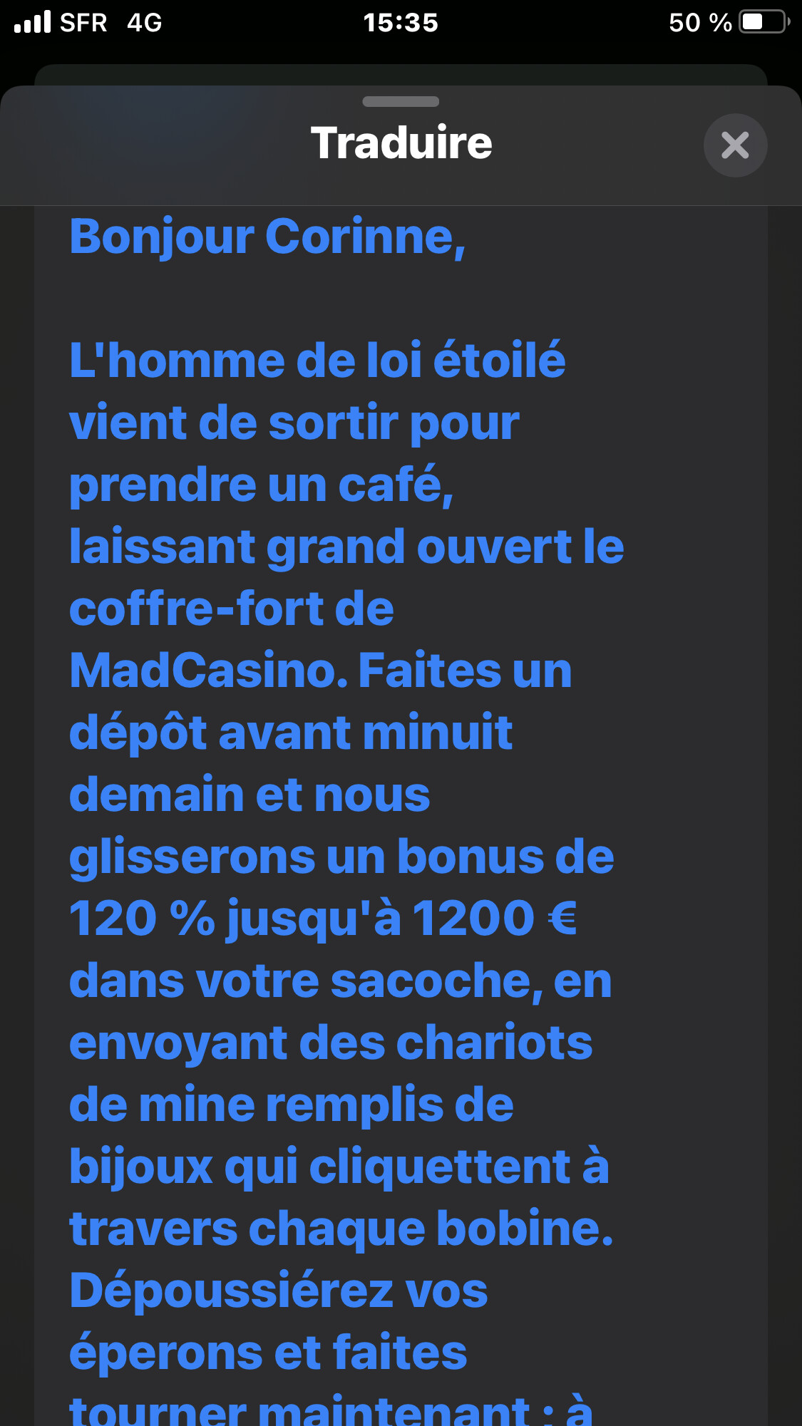Mais si tel n’avait pas été le cas et que Mad Casino n’avait rien trouvé pour confisquer les gains, il aurait probablement ressorti cette fameuse interdiction… avant de réactiver ensuite le compte en proposant un bonus alléchant, comme il l’a fait pour @Corina75.