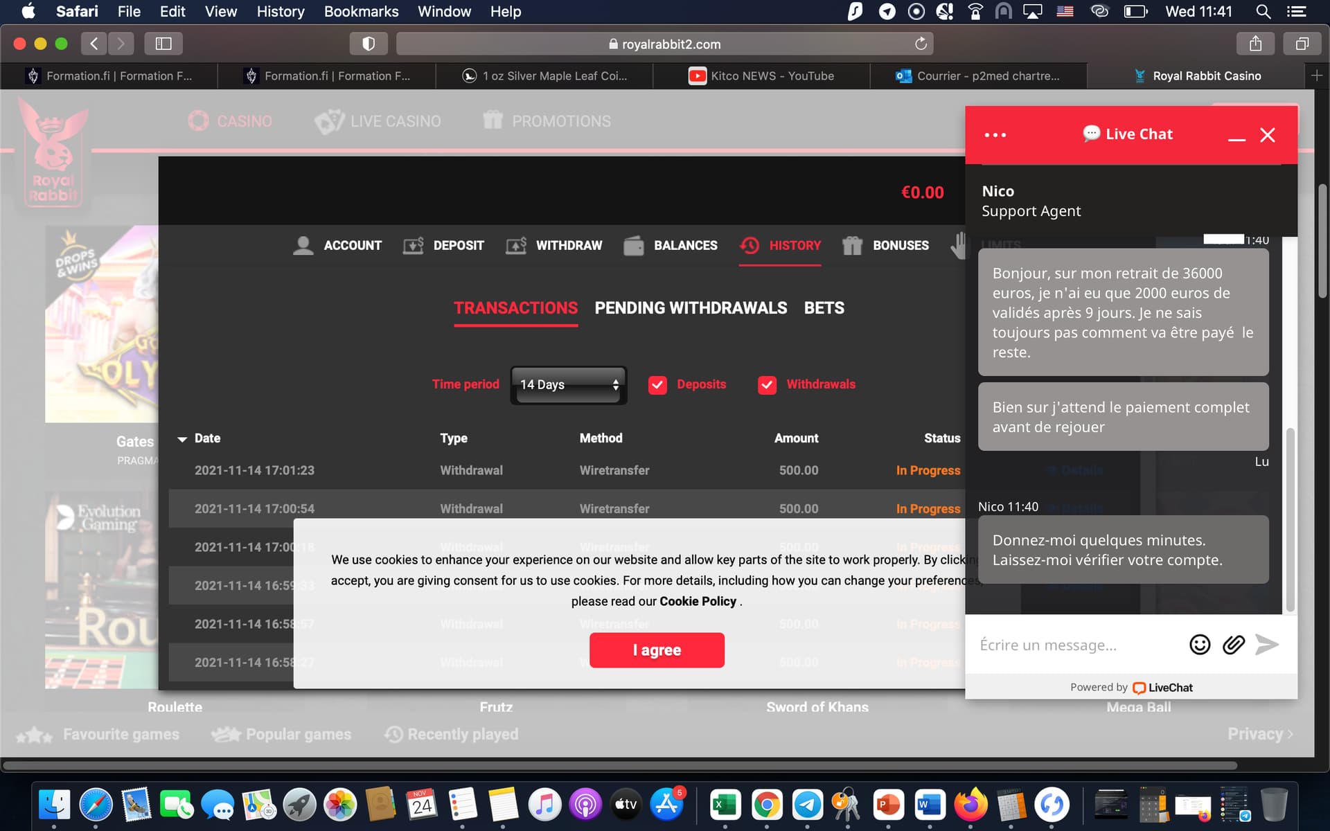 J’ai 36000 euros de retraits en attente chez RoyalRabbit depuis Dimanche dernier. Mes documents ont été validés Samedi dernier. Lundi on me dit je vais être contacté dans les 2 jours par le service financier, et là toujours rien. Donc officiellement là ils commencent à me « trainer » (Sans compter leurs emails disant que je suis VIP et que maintenant je bénéficie de retraits rapides)